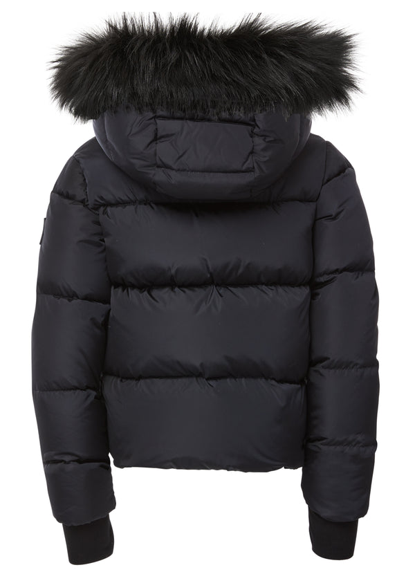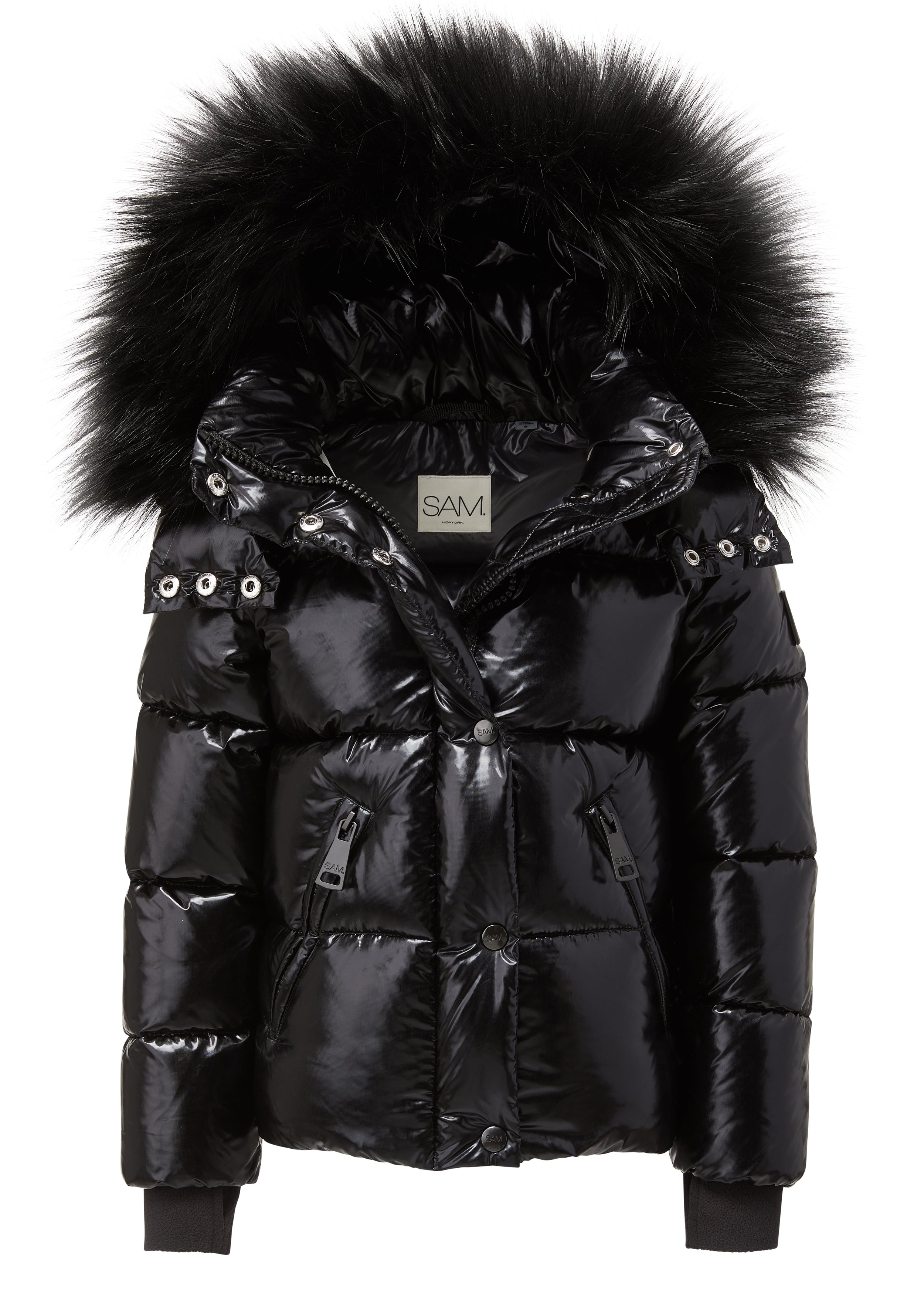 This down puffer coat is crafted from a densely woven nylon is lightweight, yet protective from wind and water, and filled with down to achieve warmth and an ultra soft feel. It features a detachable faux fur trimmed hood, a stand collar, spandex thumbhole cuffs, a center front zip and snap placket closure, and lower zip pockets.