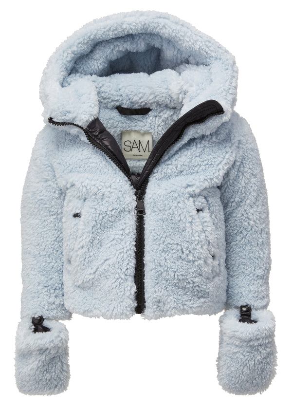 This cozy hooded jacket is crafted from a plush sherpa fabric. It is insulated with down, has a center front zip closure, has 2 snap pockets, and comes with detachable mittens.