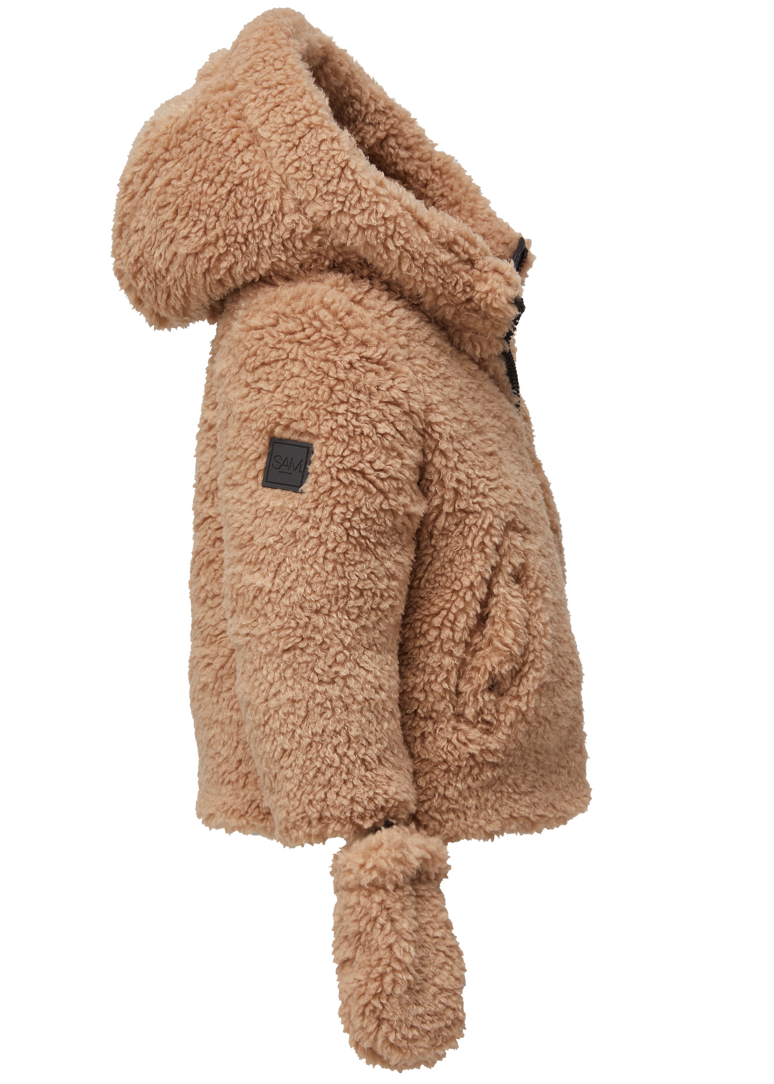 This cozy hooded baby jacket is crafted from a plush sherpa fabric. It is insulated with down, has a center front zip closure, has 2 snap pockets, and comes with detachable matching sherpa mittens.