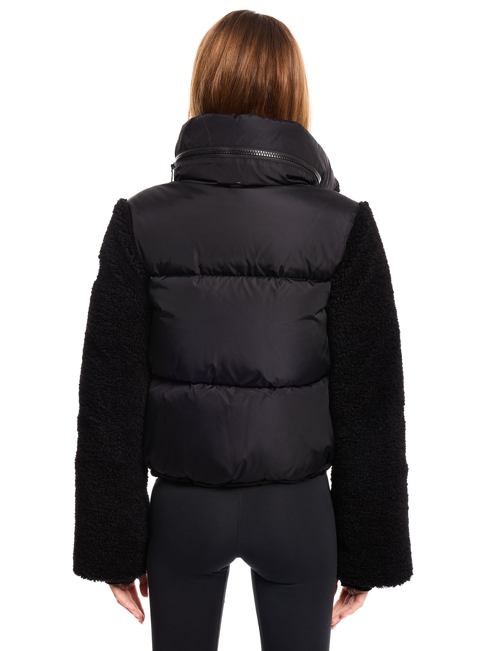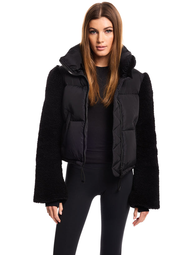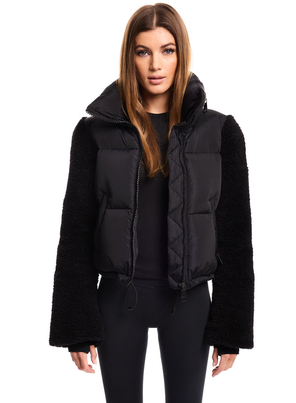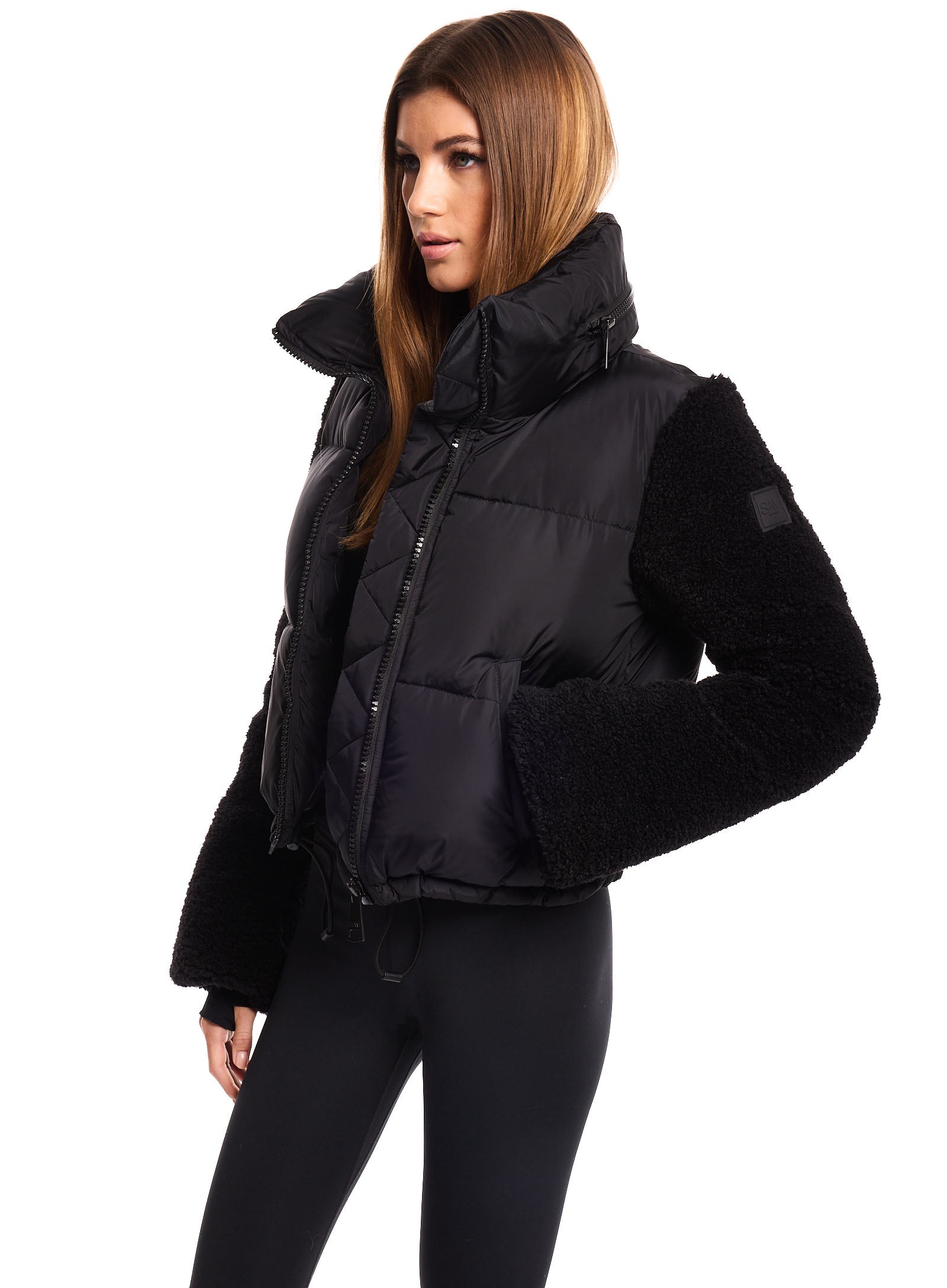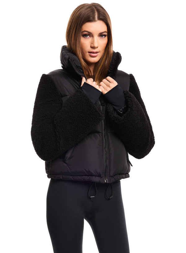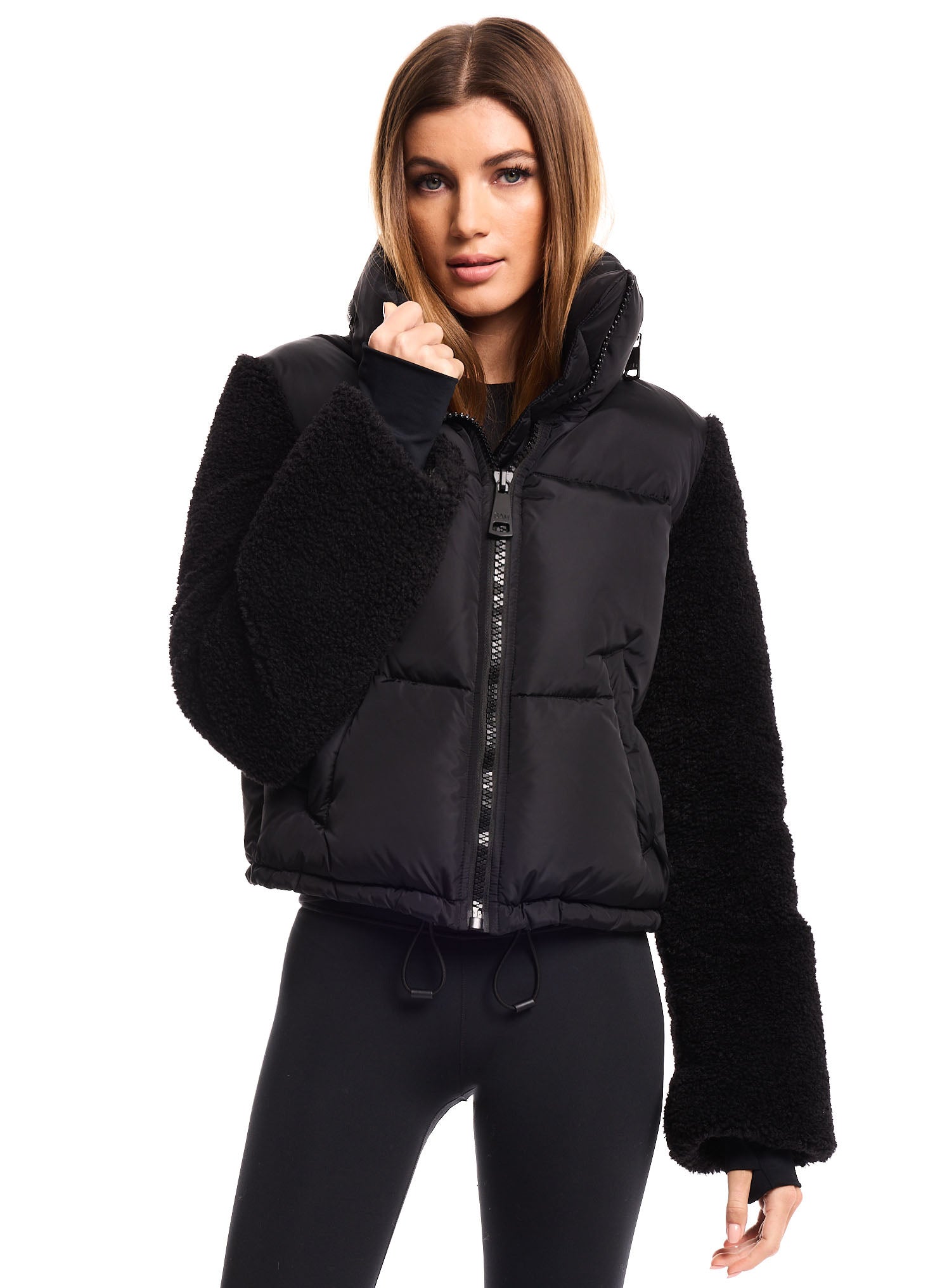 Elevate your outerwear game with the Liana Puffer Jacket, expertly designed for both style and comfort. This jacket is filled with down and features sherpa sleeves, perfectly blending fashion with functionality. With spandex thumbhole cuffs, you’ll enjoy added warmth and a secure fit, keeping the chill at bay. The adjustable drawstring waist allows you to customize your silhouette for a flattering look, whether you’re layering up.When the weather turns, the convenient roll-out hood tucked in the collar offers extra protection, ensuring you’re always prepared for the elements.